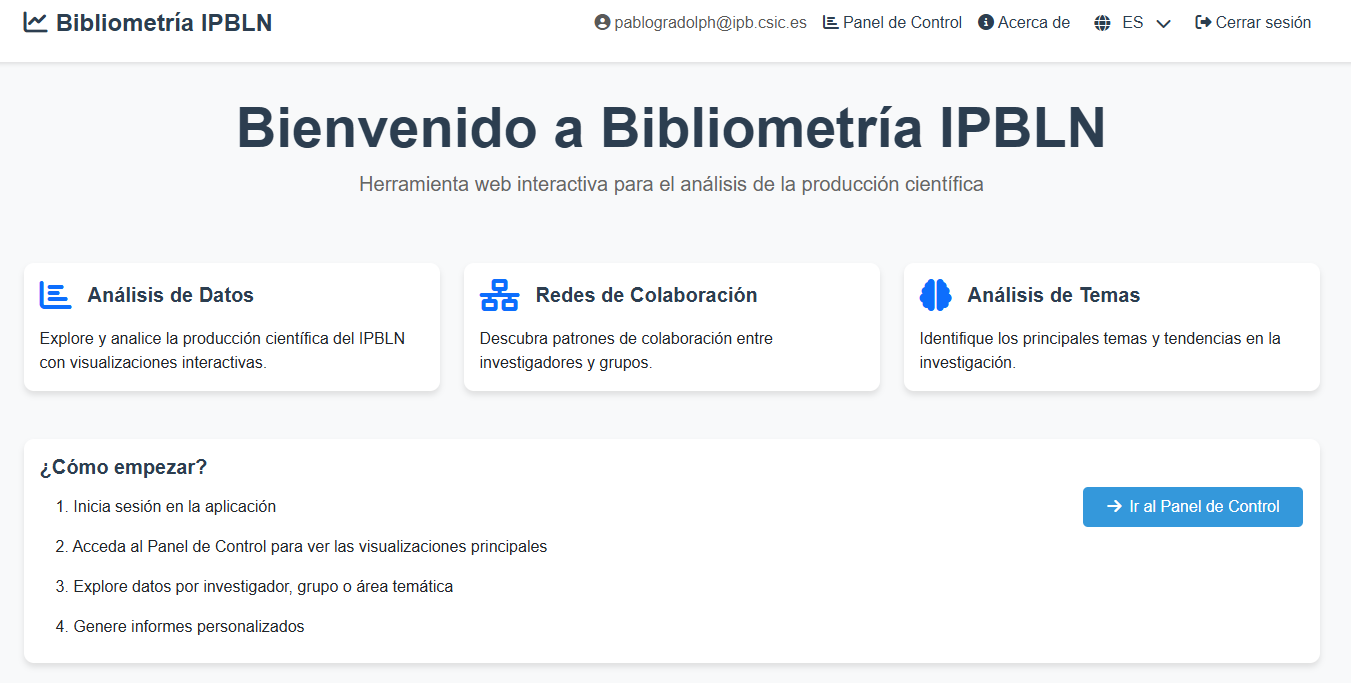 Desarrollo de una aplicación web para el análisis bibliométrico del CSIC. Creación completa de la aplicación web con Django. Visualizaciones de redes de coautoría, evolución temporal y métricas de impacto. Aplicación de técnicas de IA: NLP, clustering y análisis de grafos y comunidades. Generación automática de informes PDF, HTML y CSV.